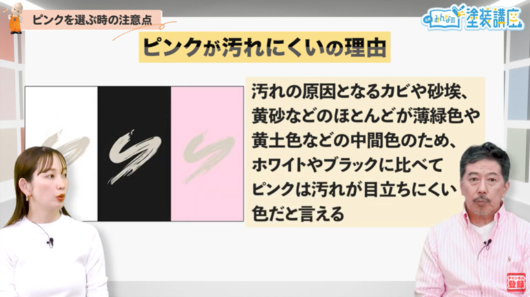 長:ピンクカラーは意外と汚れが目立ちにくいんです。汚れの原因となるカビや、砂埃、黄砂などは薄緑色や黄土色などの中間色のため、