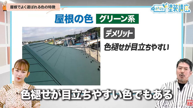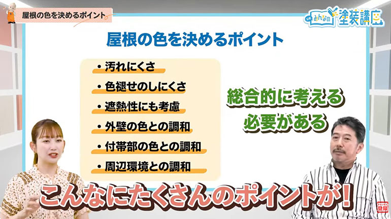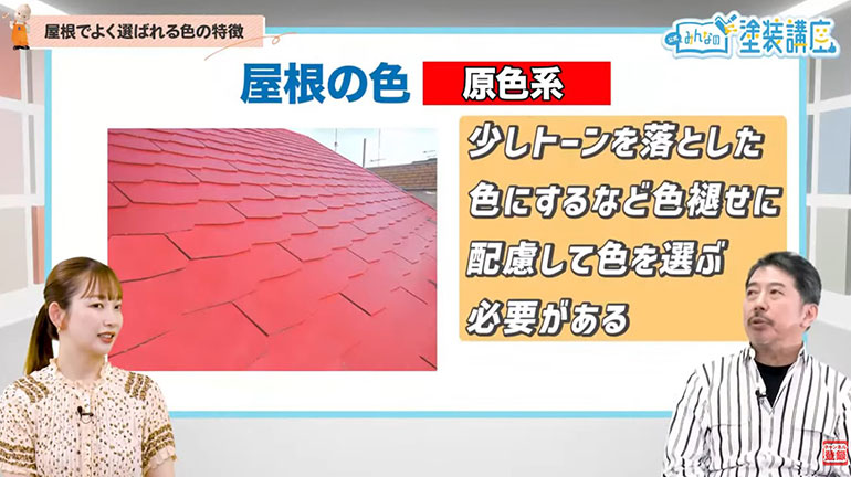 ナビゲーター 中上真亜子(以下:中上):屋根の色決めるのって難しそうじゃないですか。そこで、今回は屋根塗装のカラー別の特徴についてご紹介します。長先生よろしくお願いします。