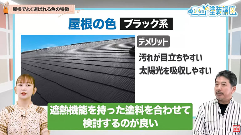 長:オールマイティですね。その一方で、汚れが目立ちやすいことがデメリット。また黒は太陽光を吸収しやすいので、遮熱機能を持った塗料を合わせて検討するのもいいでしょう。