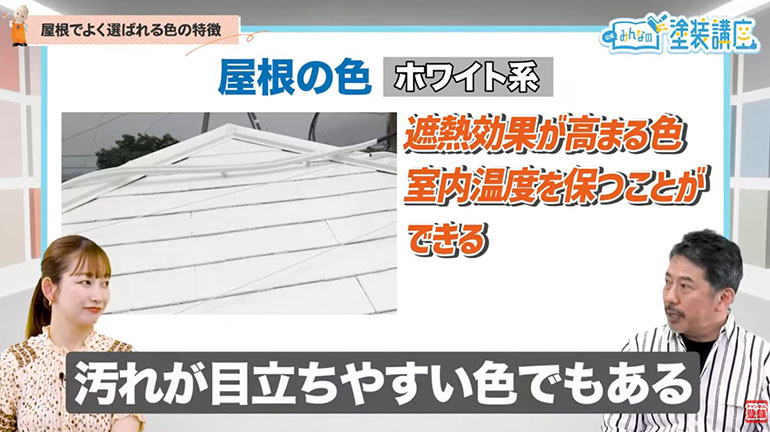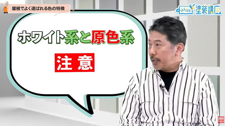 長:屋根塗装は好きな色を選択できますが、屋根にホワイト系と原色系を選びたい!という方は注意が必要です。