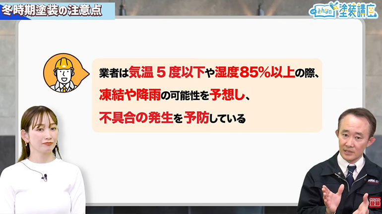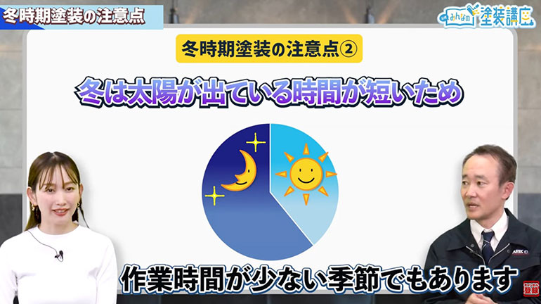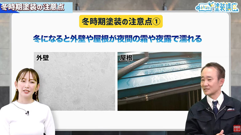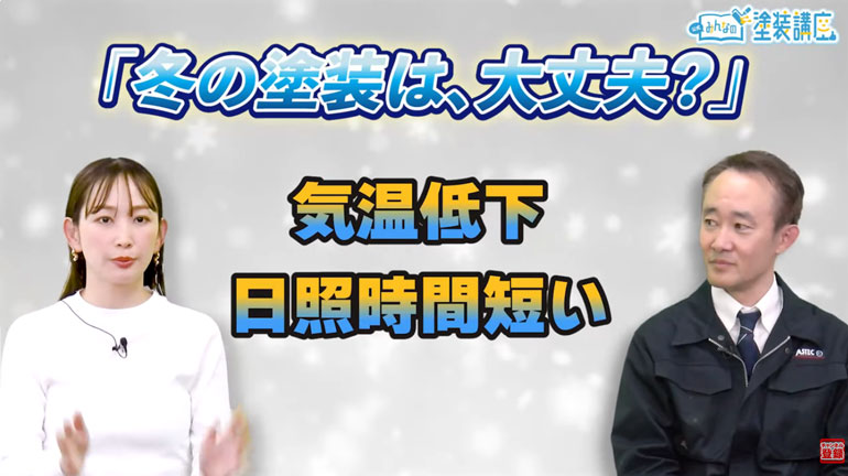 ナビゲーター 中上真亜子(以下:中上):谷口さん、この塗装講座で勉強していて思うことがあるんですけど、冬に塗装工事するのって大丈夫ですか?