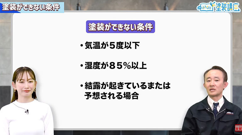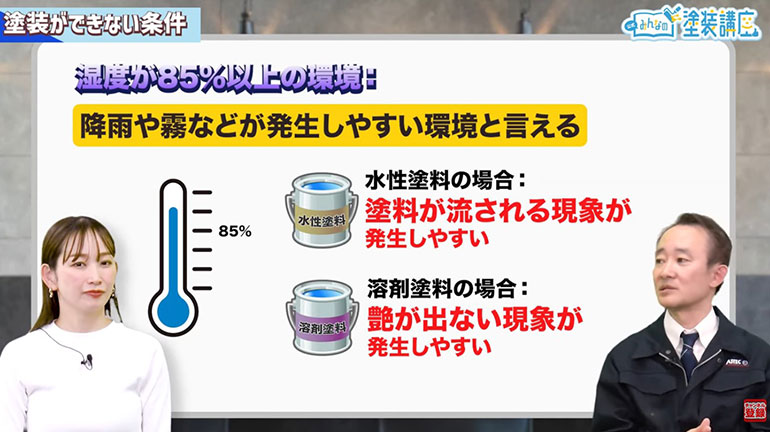 谷口:湿度が85%以上の環境とは、降雨や霧などが発生しやすい環境と言えます。水性塗料の場合では塗料が流されたり、溶剤系塗料では艶がでないという現象が発生しやすくなります。