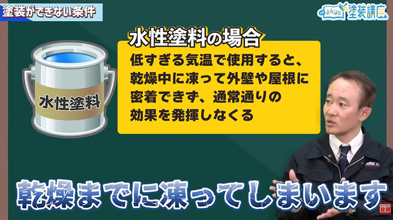 谷口:水性塗料は、低すぎる気温の中で使用すると乾燥までに凍って外壁や屋根にしっかり密着できなくなってしまうため、通常通りの効果を発揮できなくなります。