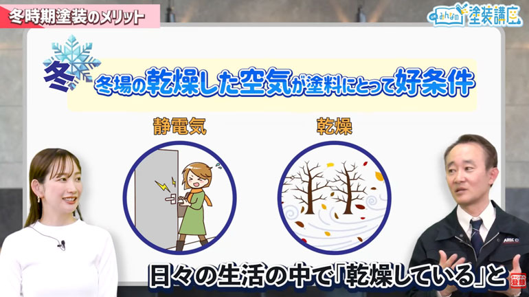谷口:冬場の乾燥した空気が塗料にとって好条件なこともある。冬場は静電気が発生したり、日々の生活の中で「乾燥している」と感じる瞬間が多いのではないでしょうか。