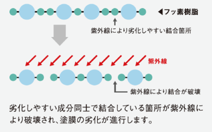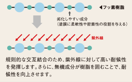 フッ素樹脂は劣化しやすい成分同士で結合している箇所が紫外線に破壊されることで塗膜の劣化が進行します。フッ素REVO500-IRは、劣化しやすい結合箇所が少ない「完全交互結合型フッ素樹脂」の採用により、紫外線に対して優れた耐候性を発揮します。