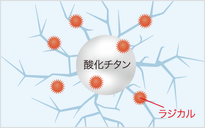 ラジカルの発生を抑制する「ラジカル制御型白色顔料」を採用。ラジカルが発生しにくく、また発生した場合にもシールド層が放出を防ぐため、ラジカルによる樹脂の破壊を抑制します。