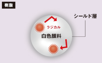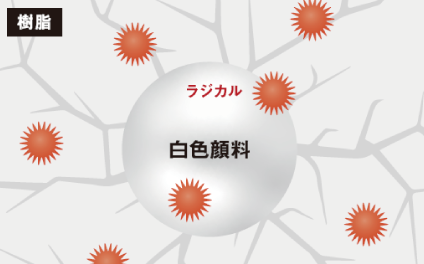 一般的に塗料で使用される白色顔料の主成分「酸化チタン」は、紫外線の影響を受けると「ラジカル」と呼ばれる劣化要因を発生させます。その劣化要因が発生すると、樹脂の結合が破壊され、塗膜が劣化してしまいます。無機REVO1000-IRはこのラジカルの発生を抑制する「ラジカル制御型白色顔料」を採用。ラジカルが発生しにくく、発生した場合にも、シールド層がラジカルの放出を防ぐため、樹脂が破壊されにくく、劣化を抑制します。