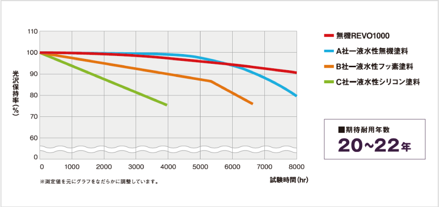 ※あくまで試験環境下における推測値であり、耐候性を保証するものではありません。実際の自然ばく露環境下では、下地の状態、施工方法、気象条件により耐候性は異なる場合があります。
